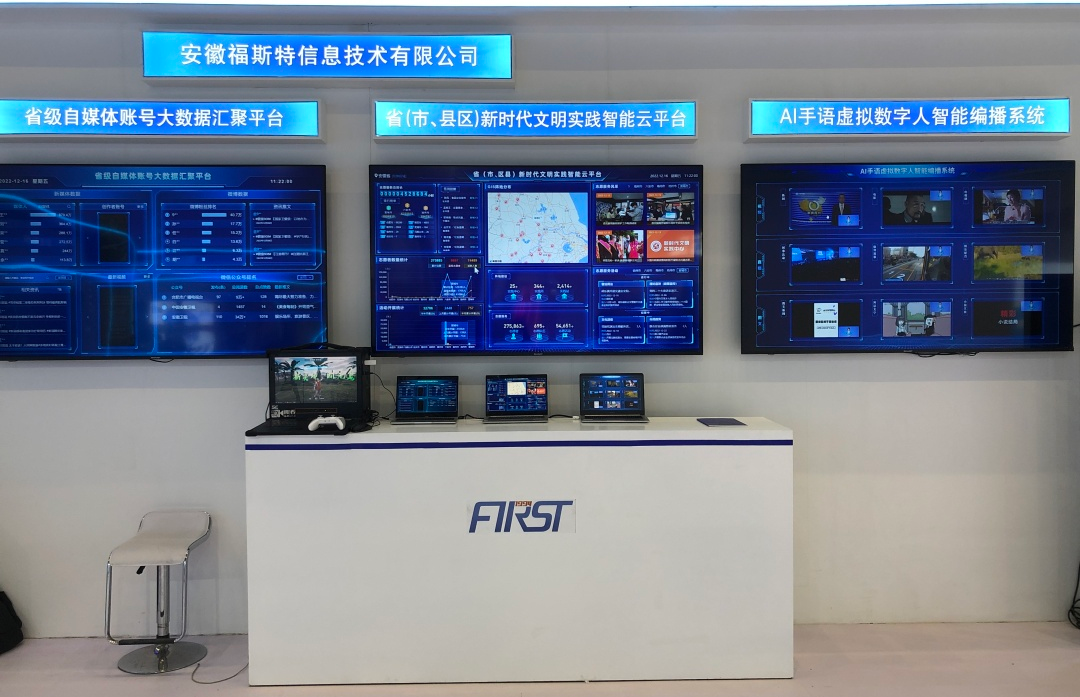 安徽福斯特信息技術(shù)有限公司此次應(yīng)邀參展,以廣電媒體發(fā)展為亮點,集中展示大數(shù)據(jù)、人工智能呈現(xiàn)了AI-VLOG視頻智能合成系統(tǒng)+AI手語虛擬數(shù)字人智能編播系統(tǒng)+省級自媒體賬號大數(shù)據(jù)匯聚平臺+省(市、縣區(qū))新時代文明實踐智能云平臺技術(shù)。